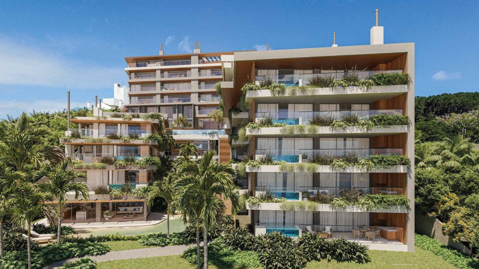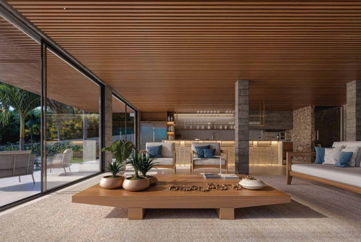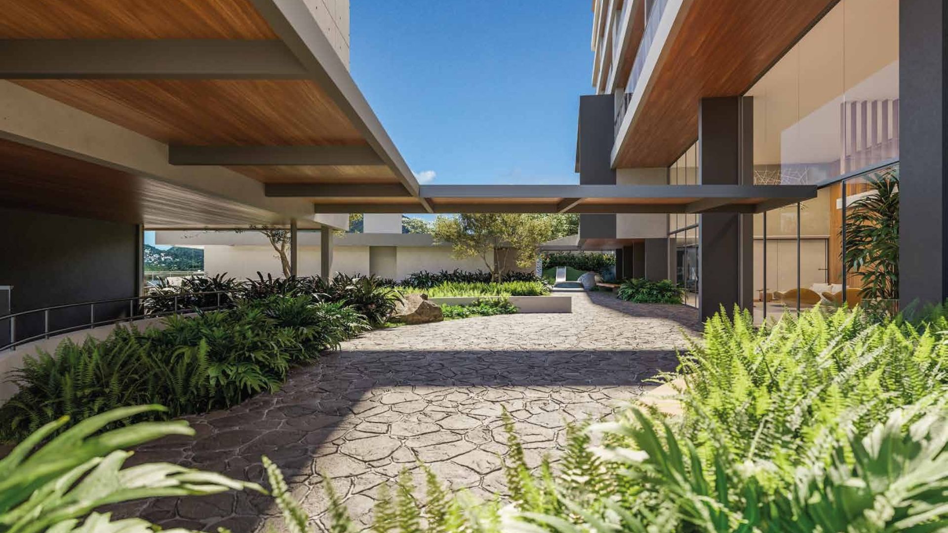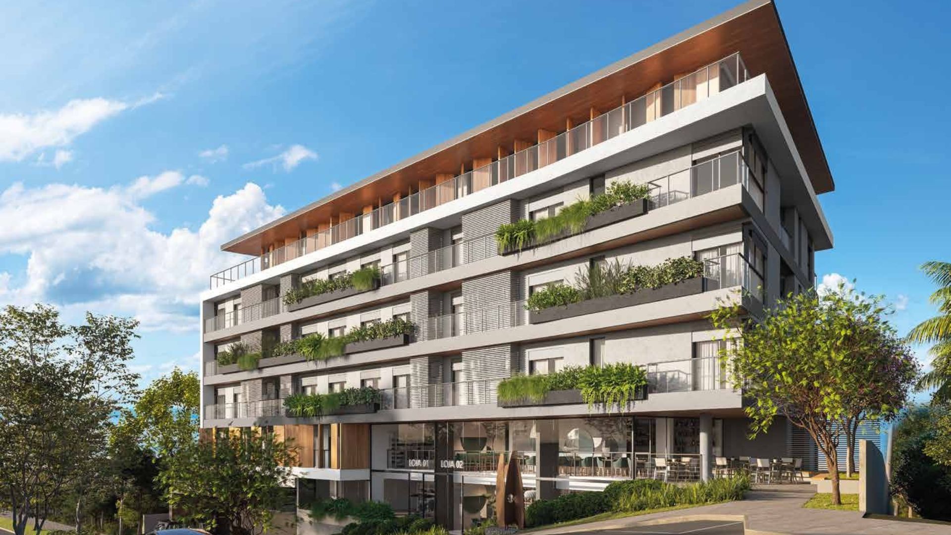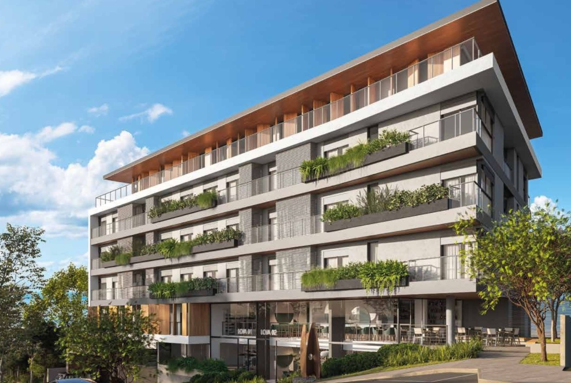 Nas fachadas voltadas para a rua, lojas térreas, passeios sombreados e áreas de estar promovem uma vida urbana dinâmica, enquanto no interior do condomínio o clima é de refúgio, silêncio e contemplação da natureza, com o mar como cenário permanente.