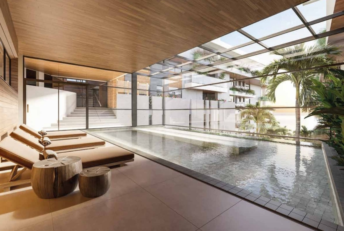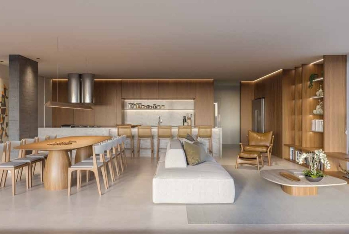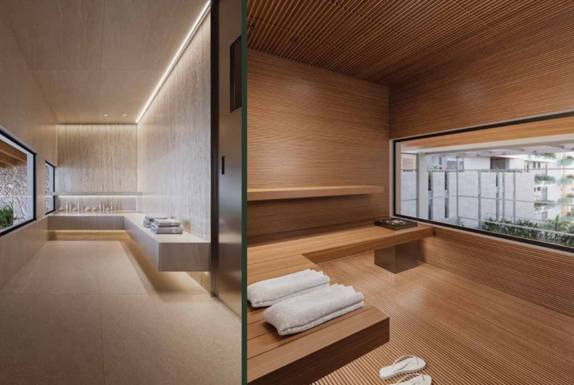 Os ambientes de circulação interna foram projetados para manter o mesmo padrão de elegância das áreas principais, com design de interiores contínuo e iluminação acolhedora. Caminhar até o espaço zen, a piscina térmica ou as áreas de convivência é parte da experiência de morar no empreendimento, reforçando a sensação de refúgio urbano à beira-mar.