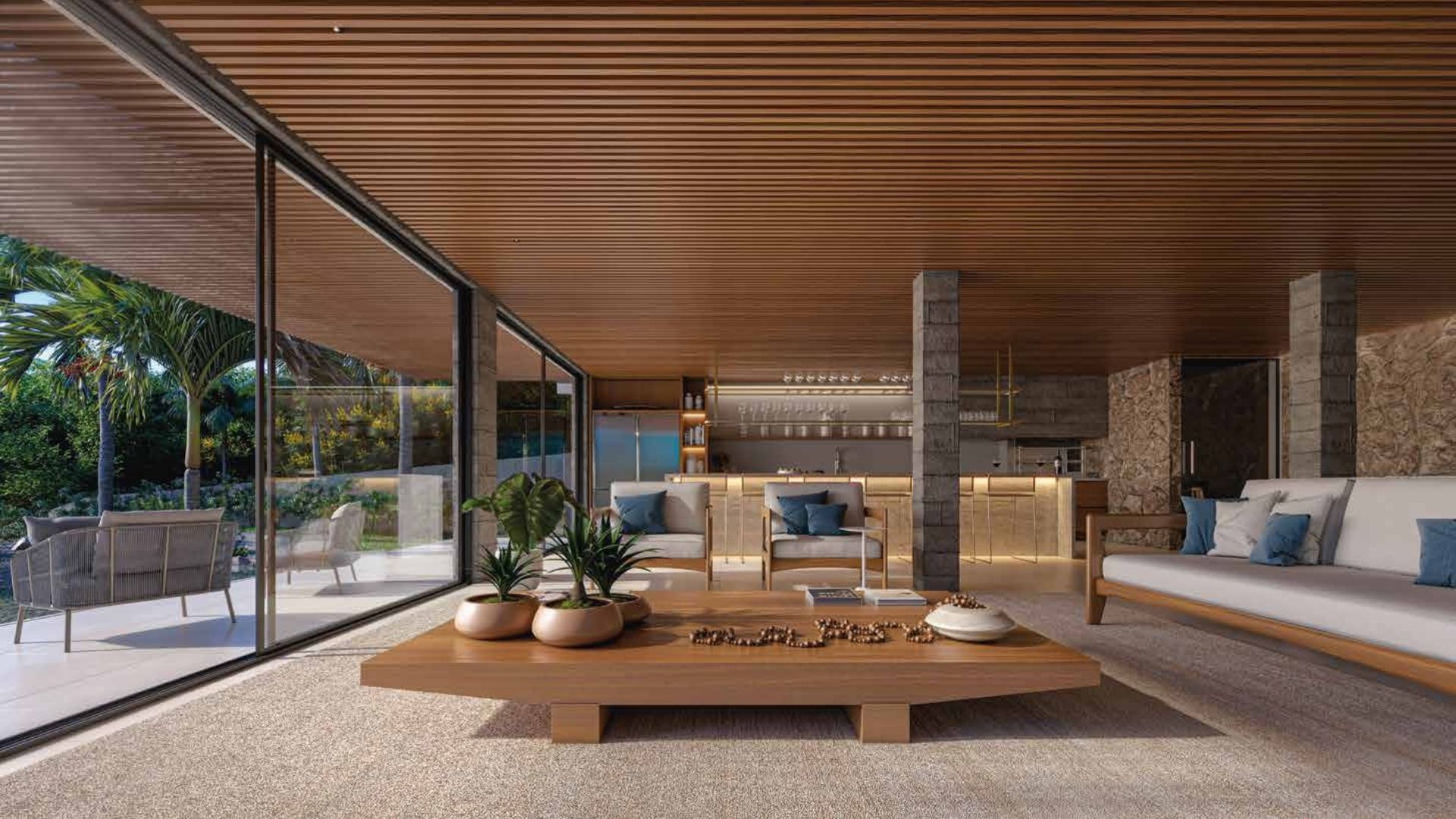 A arquitetura valoriza materiais naturais como concreto, madeira e amplas aberturas envidraçadas, em harmonia com a vegetação da Mata Atlântica ao redor. Brises amadeirados ajudam a controlar a incidência solar, oferecendo conforto térmico e visual e emoldurando a paisagem da baía.